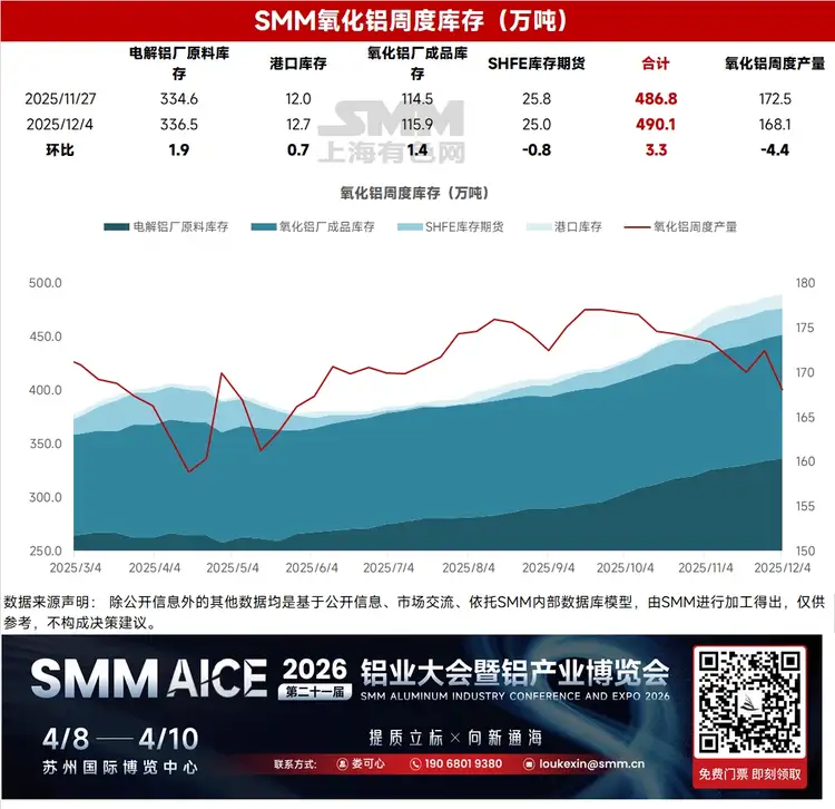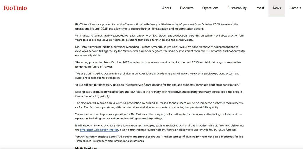 力拓2026年10月将削减Yarwun氧化铝厂40%产能【SMM铝快讯】11月18日,力拓官网发布消息,宣布将从2026年10月起将其位于Gladstone的Yarwun氧化铝精炼厂产能削减40%。主要原因系如果维持当前的运行产能,Yarwun当前的尾矿储备将于2031年达到饱和。该减产决策旨在为工厂提供足够的时间通过寻求技术破局来实现工厂的长期运营,当前的减产决策可延长氧化铝厂4年的运营时间至2035年。公司表示尽管多年探讨建设第二尾矿设施方案,但所需投资规模巨大且当前经济可行性不足,建设不足预期。 减产措施将导致精炼厂约180个岗位受到影响,力拓正优先推进其在Gladstone各厂区的人员内部调配计划。此举将使年氧化铝产量减少约120万吨,但不会影响客户需求及集团其他业务,铝土矿开采和电解铝业务仍将满负荷运行。据SMM分析,该项目的减产难以扭转海外氧化铝供需过剩格局,随着2026年海外氧化铝项目的逐步建成投产,预计海外氧化铝价格维持震荡走弱。