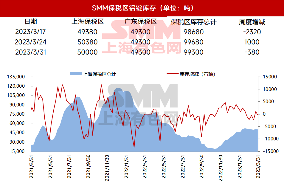 3月31日,SMM统计上海保税区电解铝库存为50000吨,广东保税区库存49300吨,总计库存99300吨,周度环比减少380吨。
