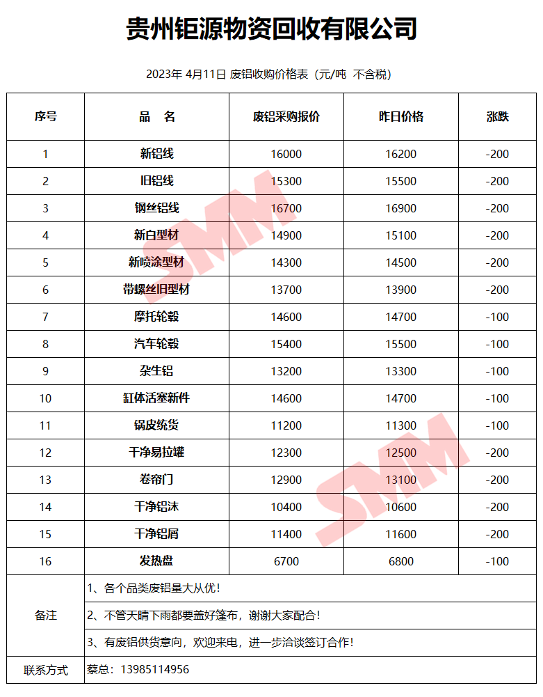 4月11日贵州钜源 废铝收购报价
