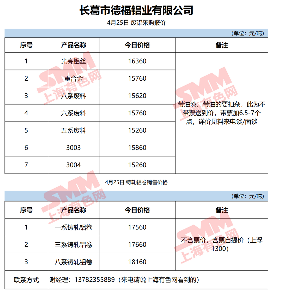 4月25日长葛德福铝业 废铝采购报价