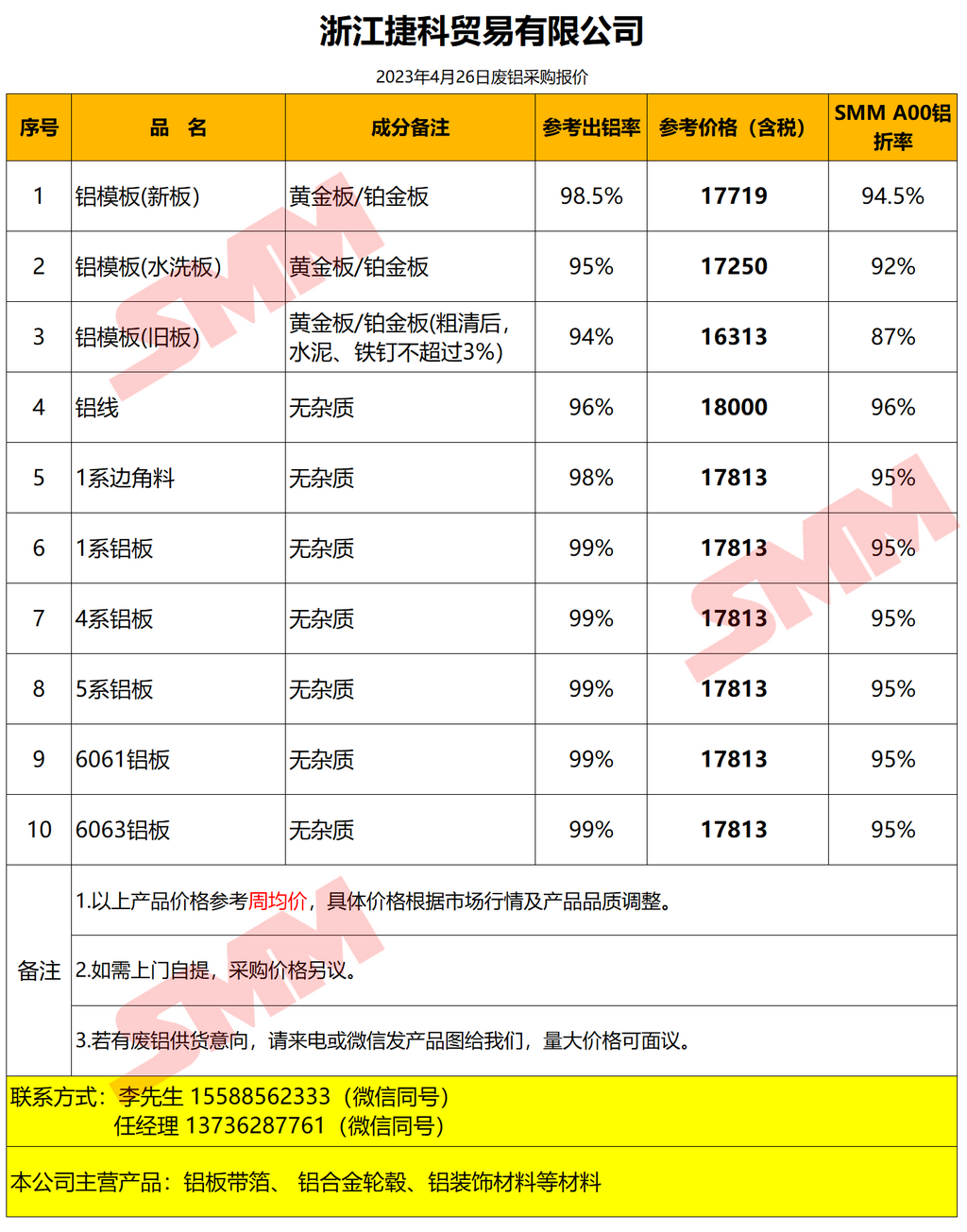 今日捷科贸易 废铝采购报价已更新,有货的朋友欢迎联系我们!