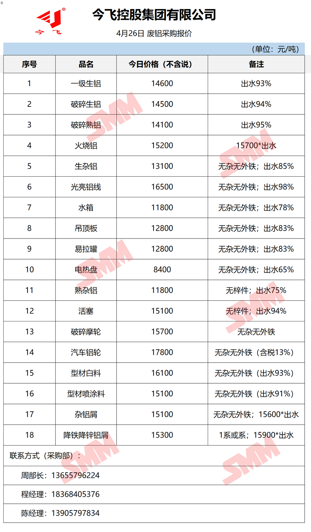 4月26日今飞集团 废铝采购报价
