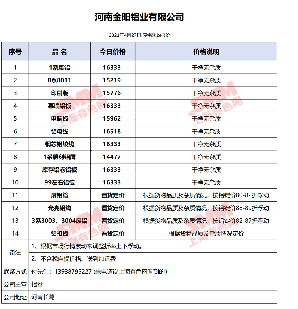 今日河南金阳铝业有限公司 废铝采购报价已更新,有货的朋友欢迎联系我们!