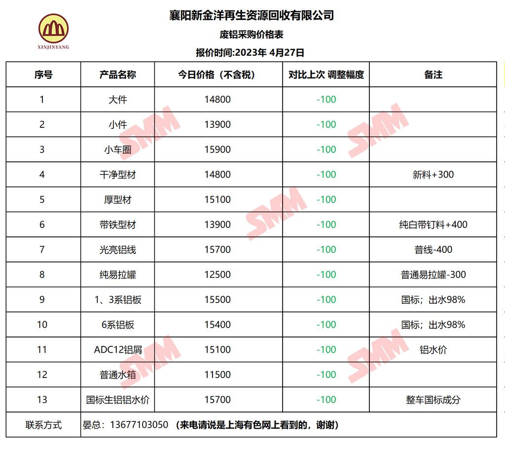 4月27日襄阳新金洋 废铝采购报价