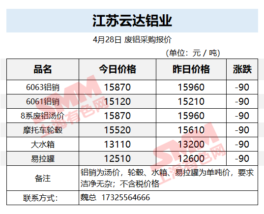 4月28日江苏云达铝业 废铝采购报价