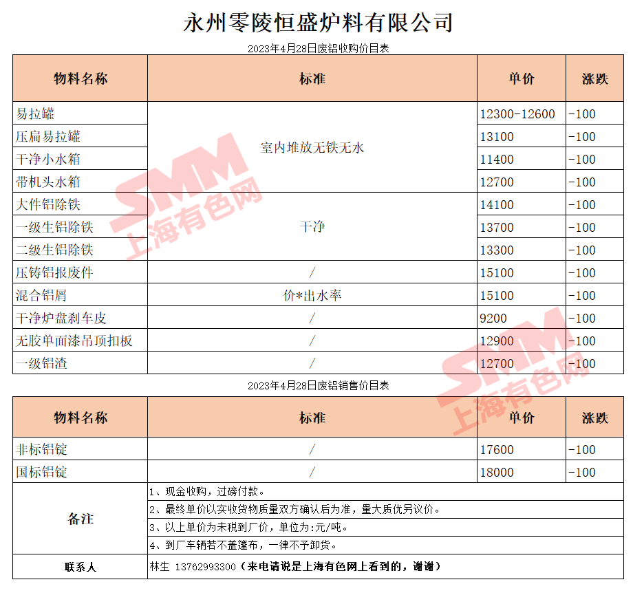 4月28日湖南恒盛 废铝收购报价