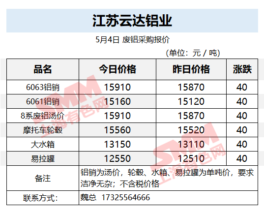今日江苏云达铝业 废铝采购报价已更新,有货的朋友欢迎联系我们!