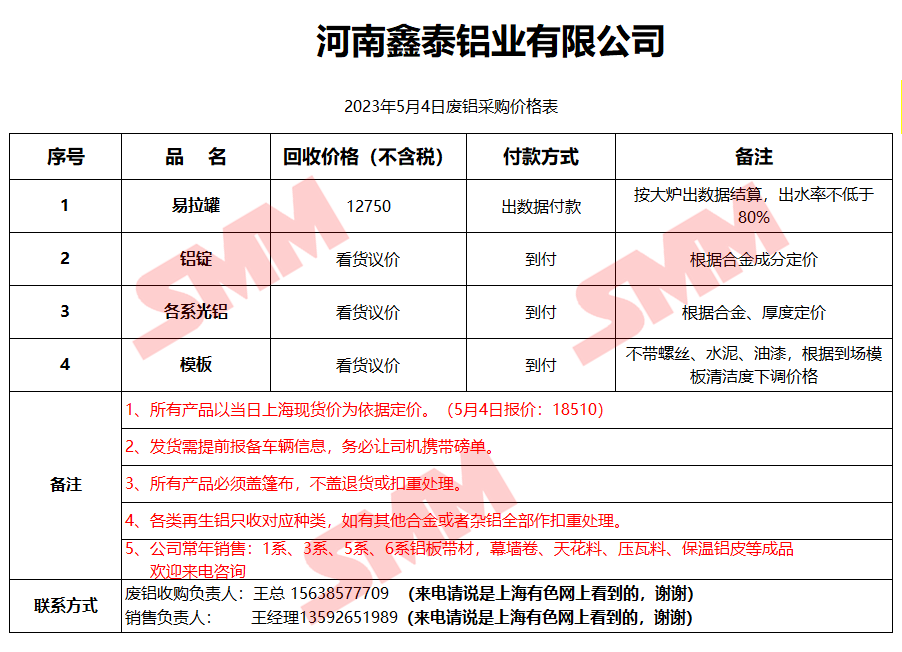 5月4日河南鑫泰铝业 废铝采购报价