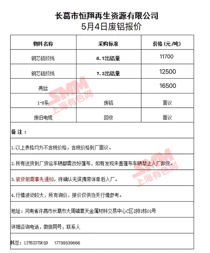 5月4日长葛恒翔 废铝采购报价