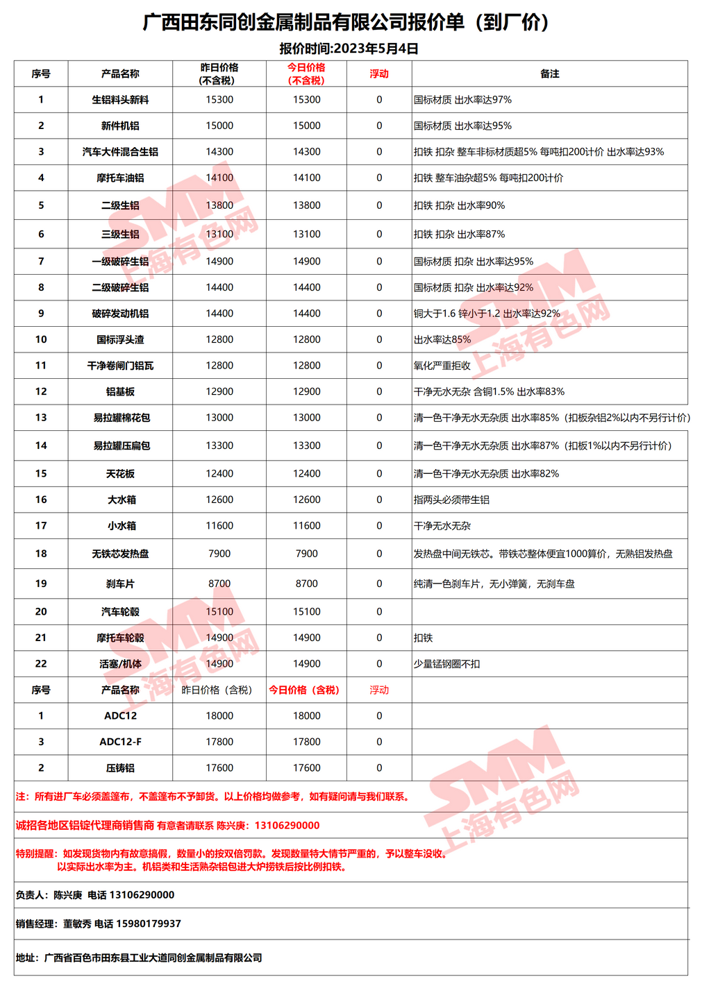 今日广西田东同创金属制品有限公司 废铝采购报价已更新,有货的朋友欢迎联系我们!