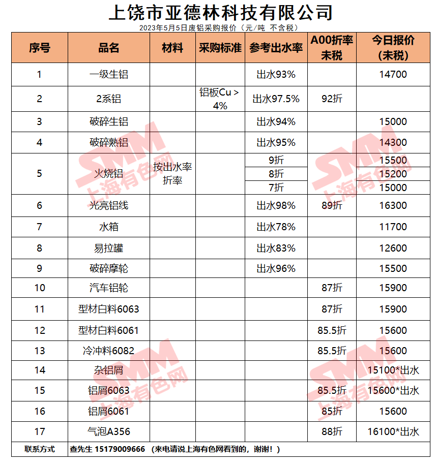 上饶市亚德林今日主要废铝料收购价目表已更新,有货的朋友欢迎联系我们!