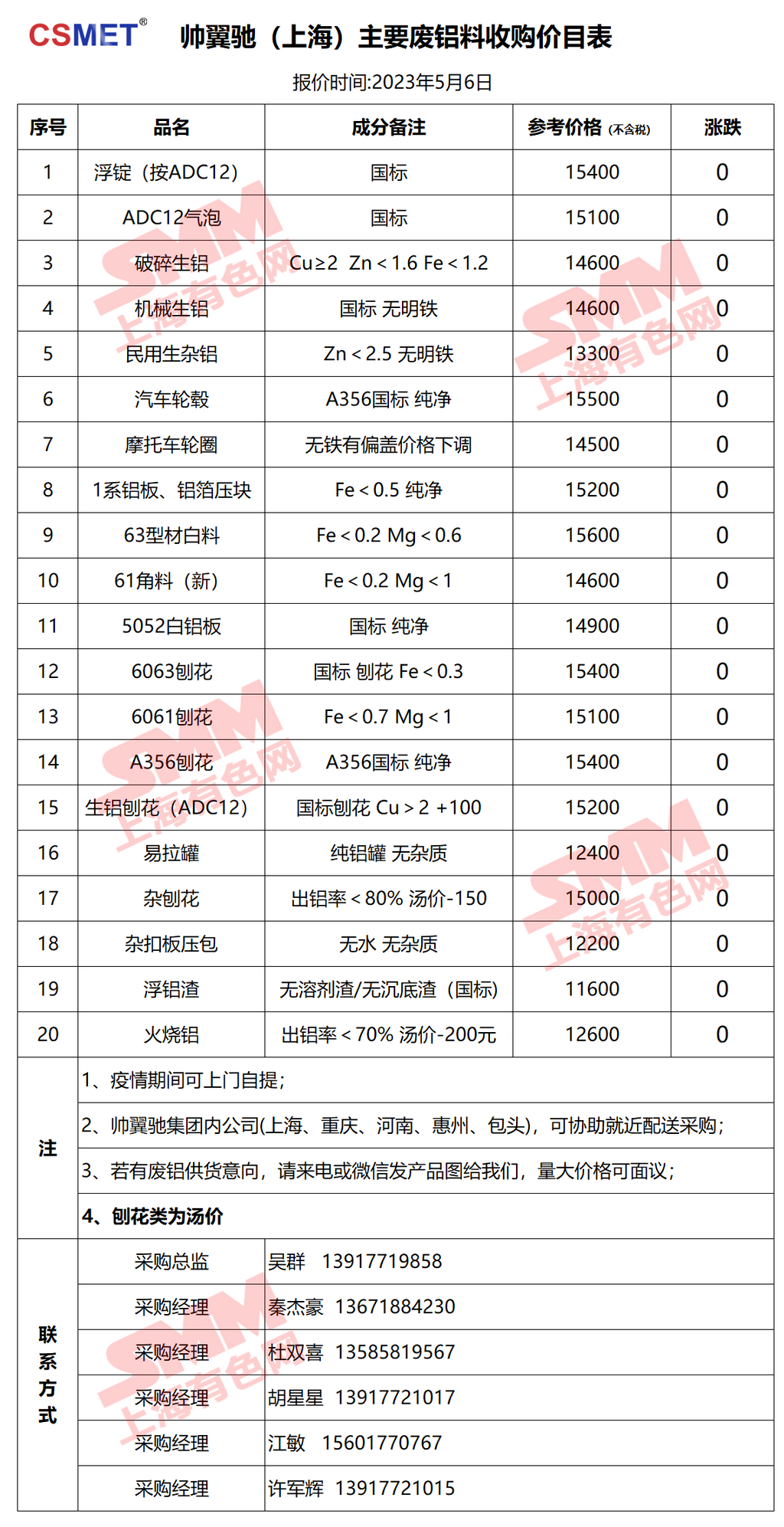 5月6日帅翼驰(上海) 废铝采购报价
