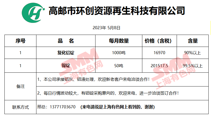5月8日高邮环创铝业 再生铝锭销售报价
