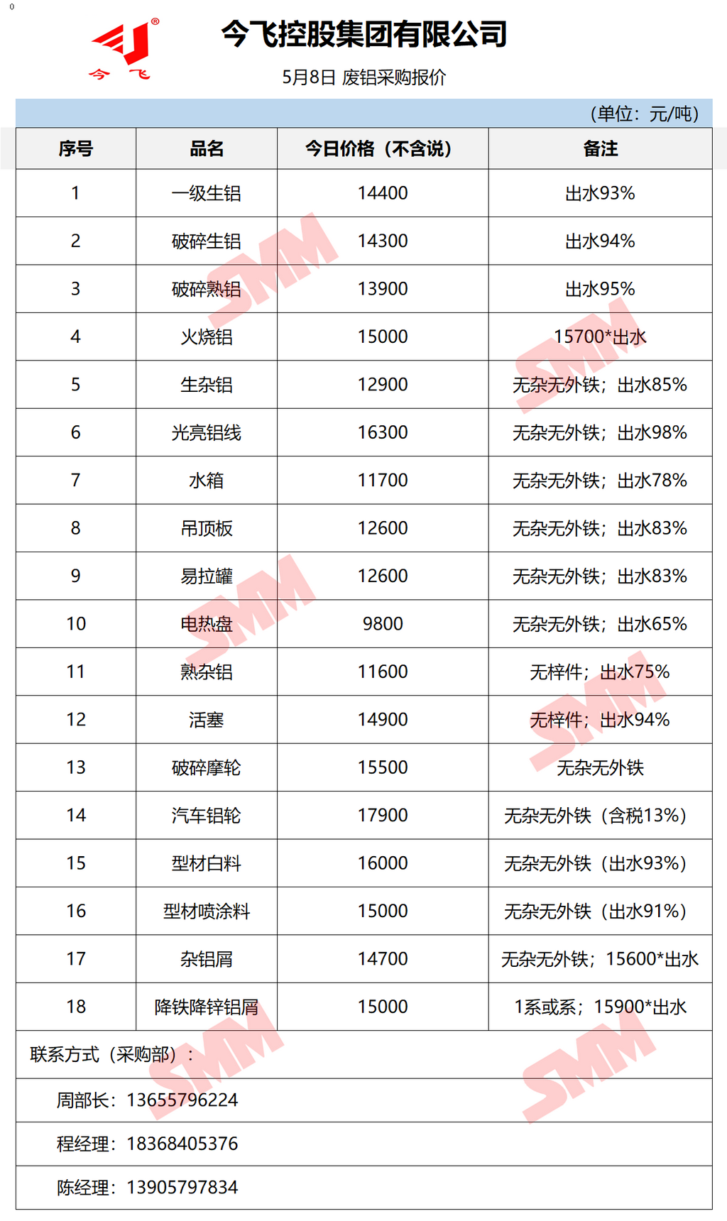 5月8日今飞集团 废铝采购报价