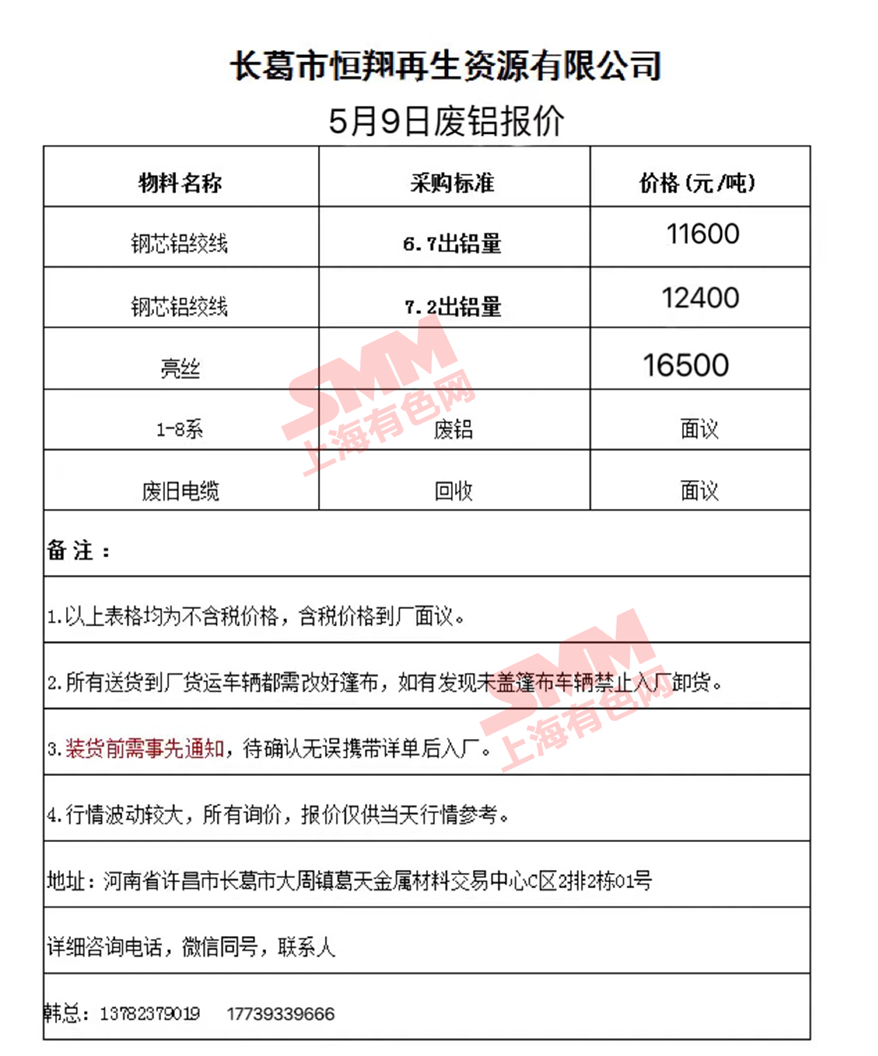 5月9日长葛恒翔 废铝采购报价