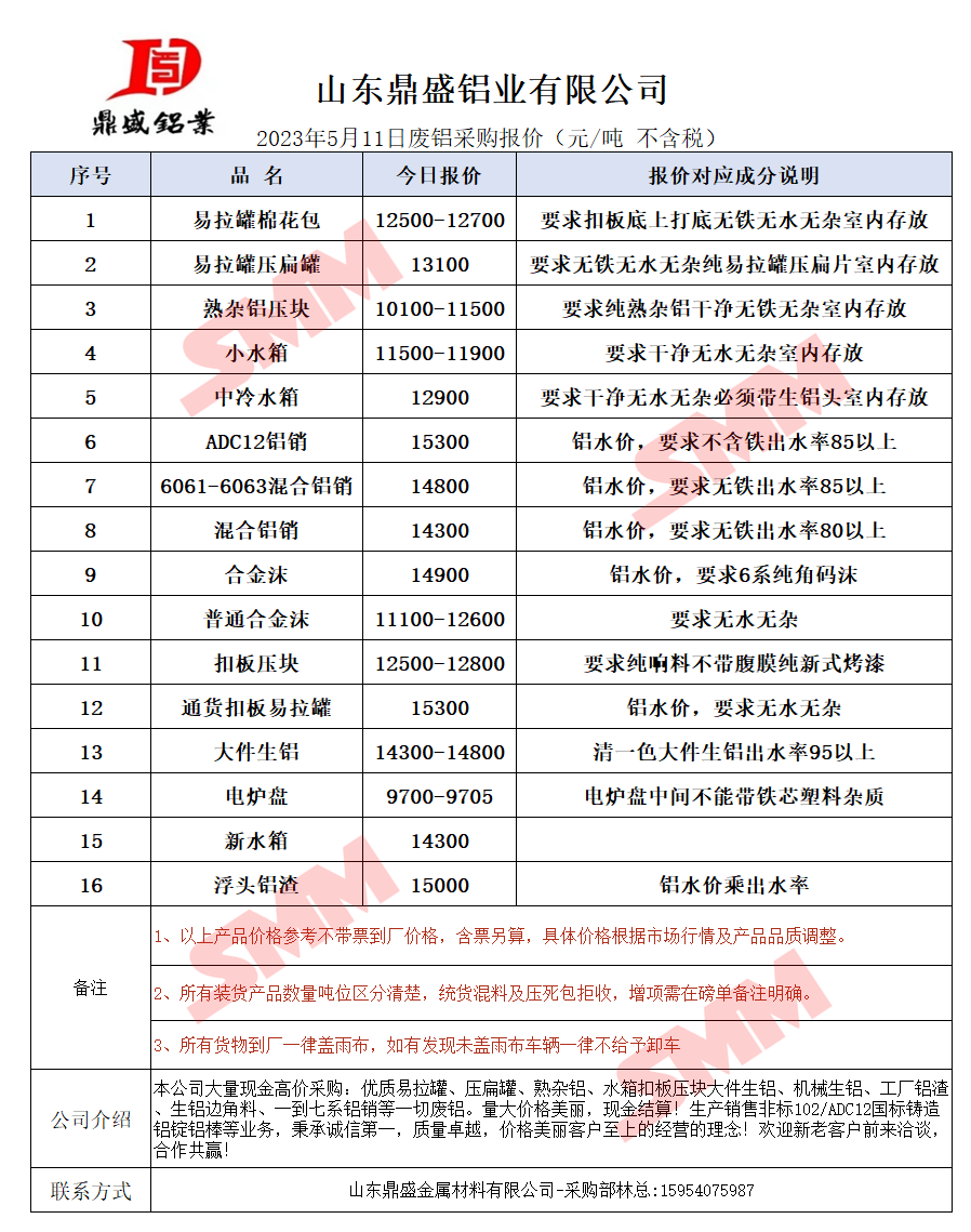 5月11日山东鼎盛 废铝采购报价