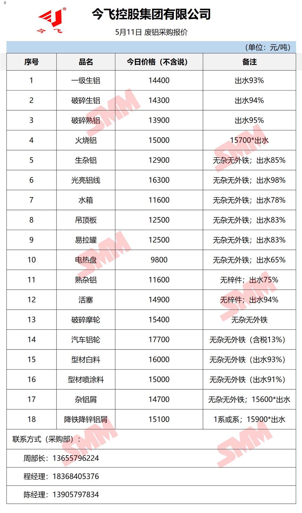 今日今飞集团 废铝采购报价已更新,有货的朋友欢迎联系我们!