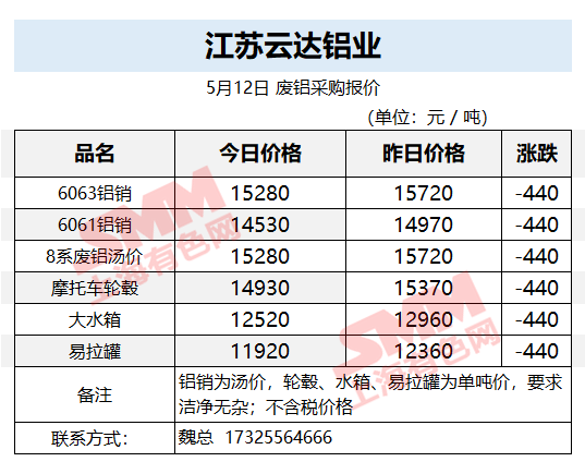 5月12日江苏云达铝业 废铝采购报价