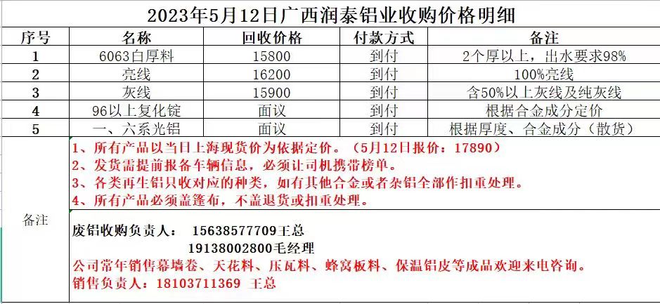 5月12日广西润泰铝业 废铝采购报价