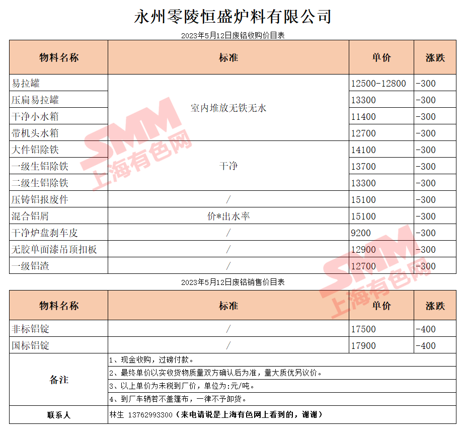 5月12日湖南恒盛 废铝收购报价