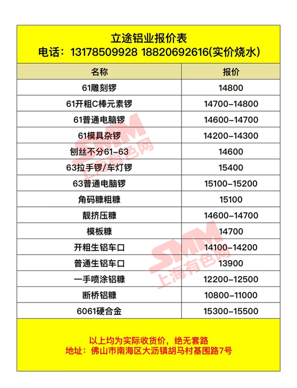 佛山立途铝业有限公司 今日废铝采购报价已更新,有货的欢迎来电咨询。