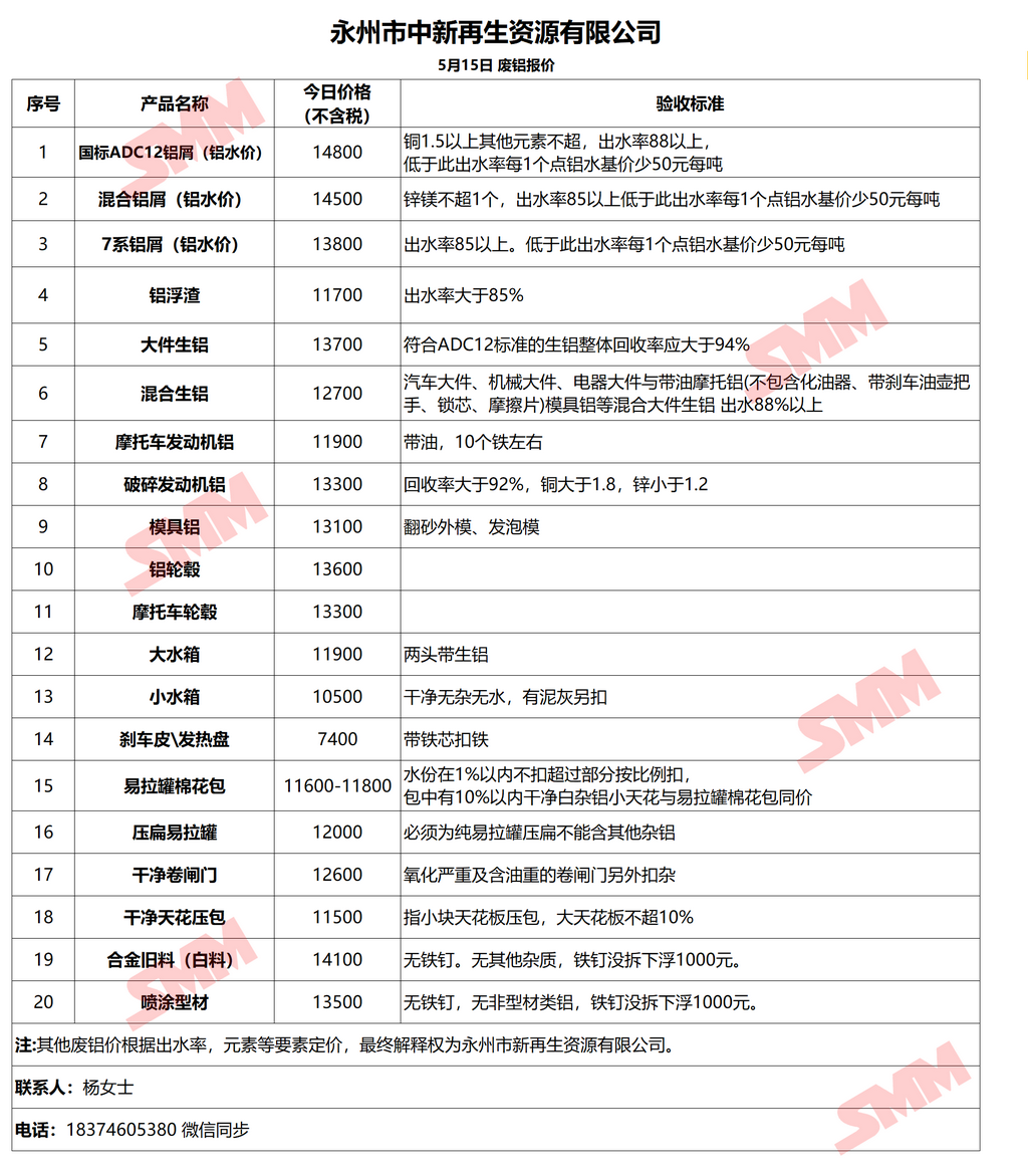 5月15日中新再生 废铝采购报价