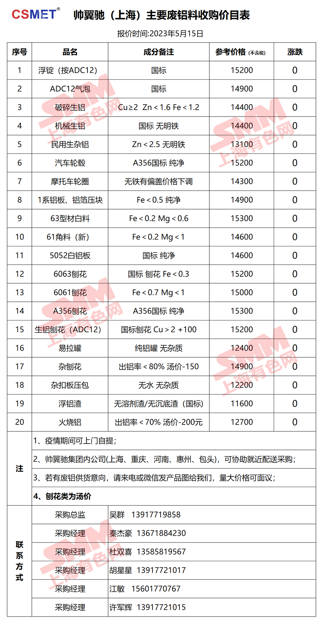 5月15日帅翼驰(上海) 废铝采购报价