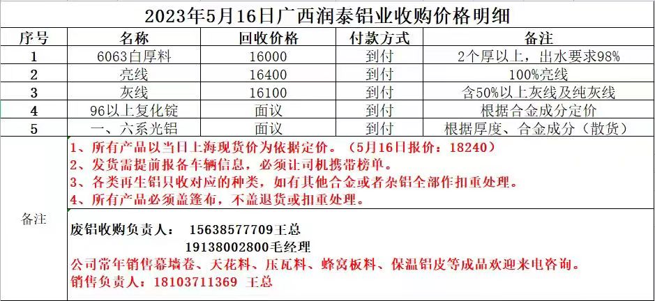 5月16日广西润泰铝业 废铝采购报价