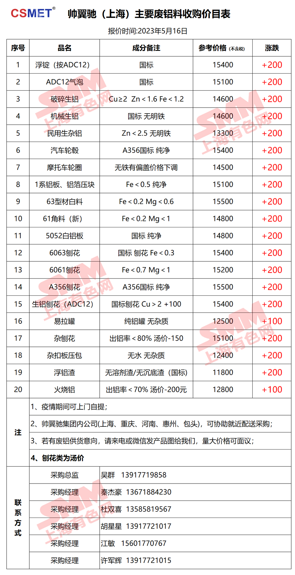 5月16日帅翼驰(上海) 废铝采购报价