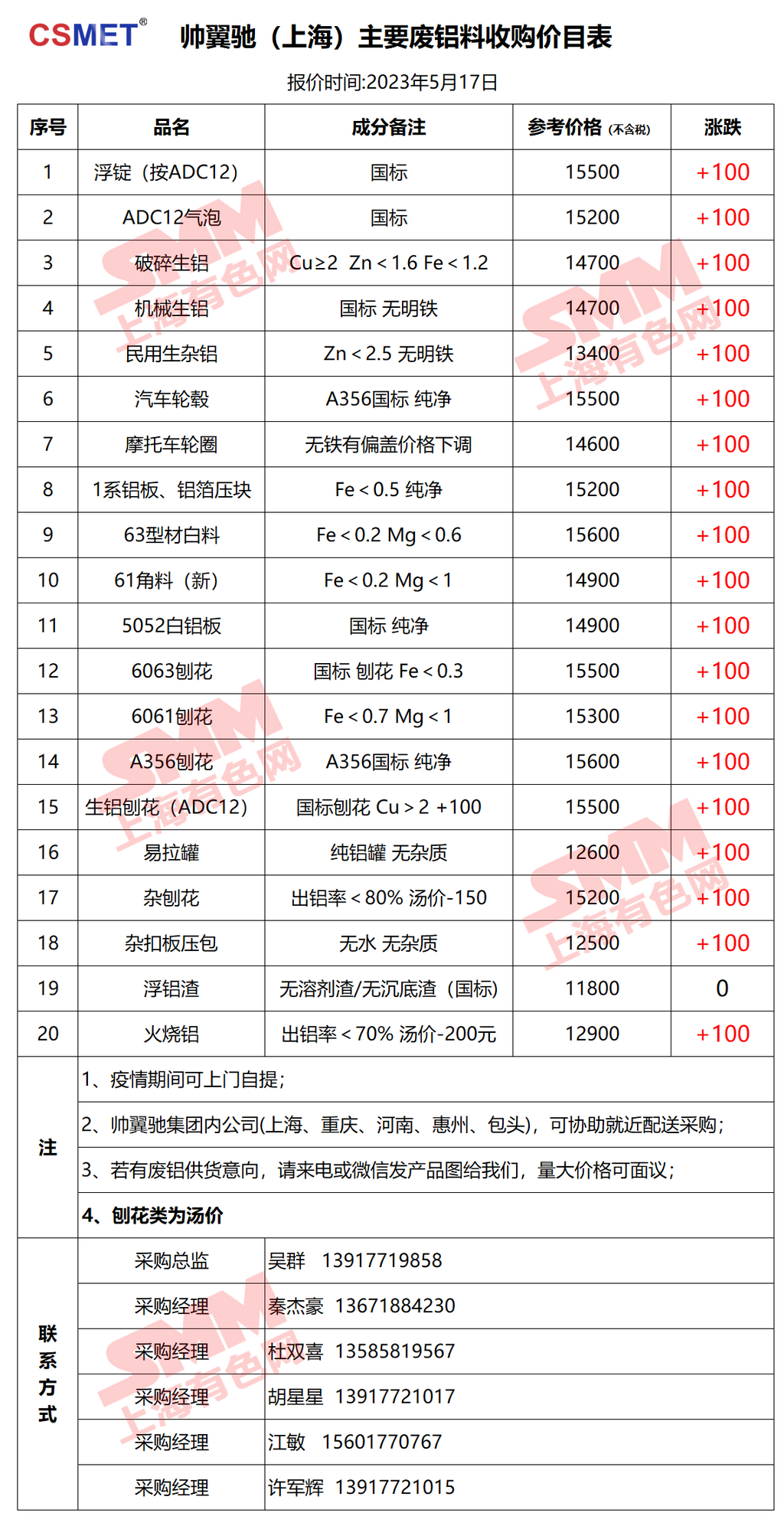 帅翼驰(上海)今日主要废铝料收购价目表已更新,有货的朋友欢迎联系我们!