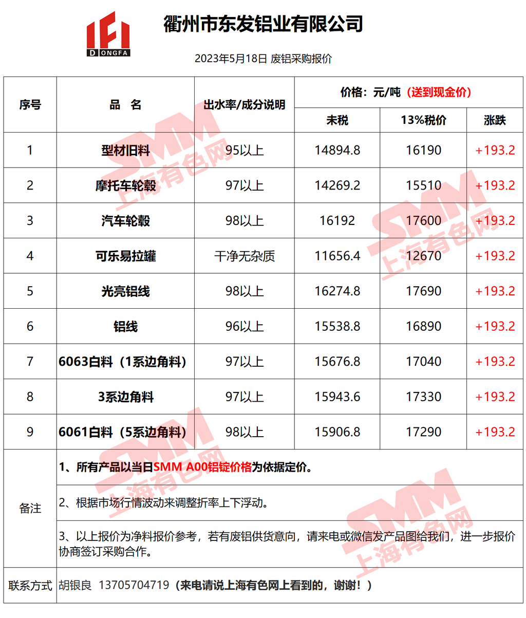 5月18日衢州东发 废铝采购报价