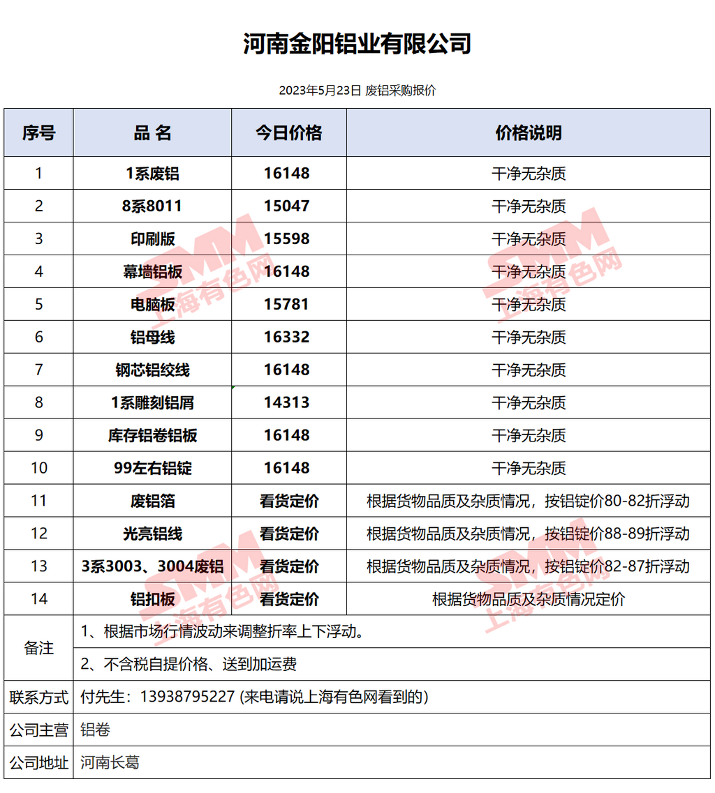 5月23日河南金阳 废铝采购报价