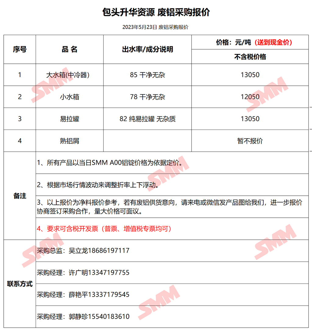 5月23日包头升华 废铝采购报价