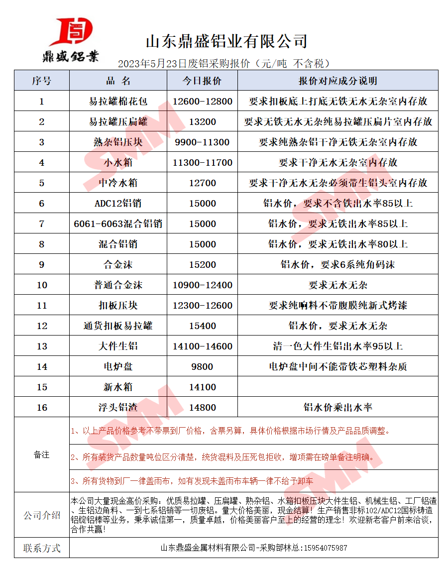 5月23日山东鼎盛 废铝采购报价