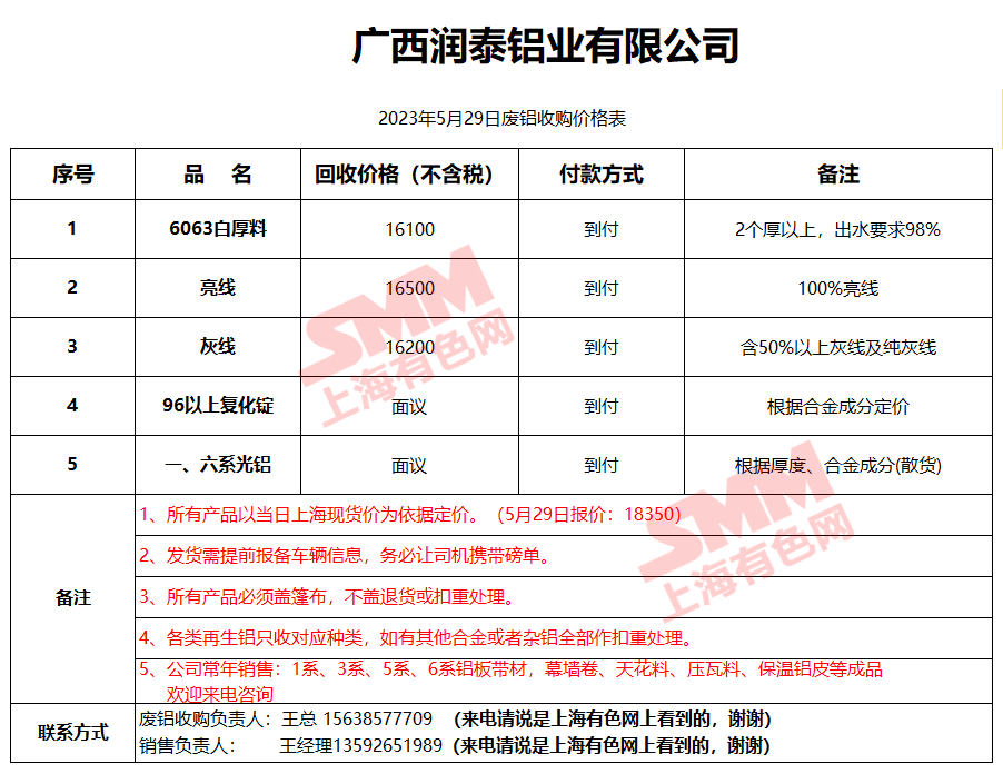 5月29日广西润泰铝业 废铝采购报价