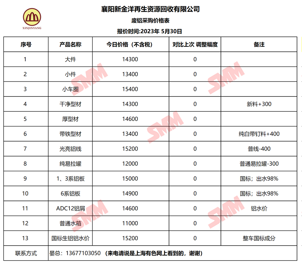 5月30日襄阳新金洋 废铝采购报价
