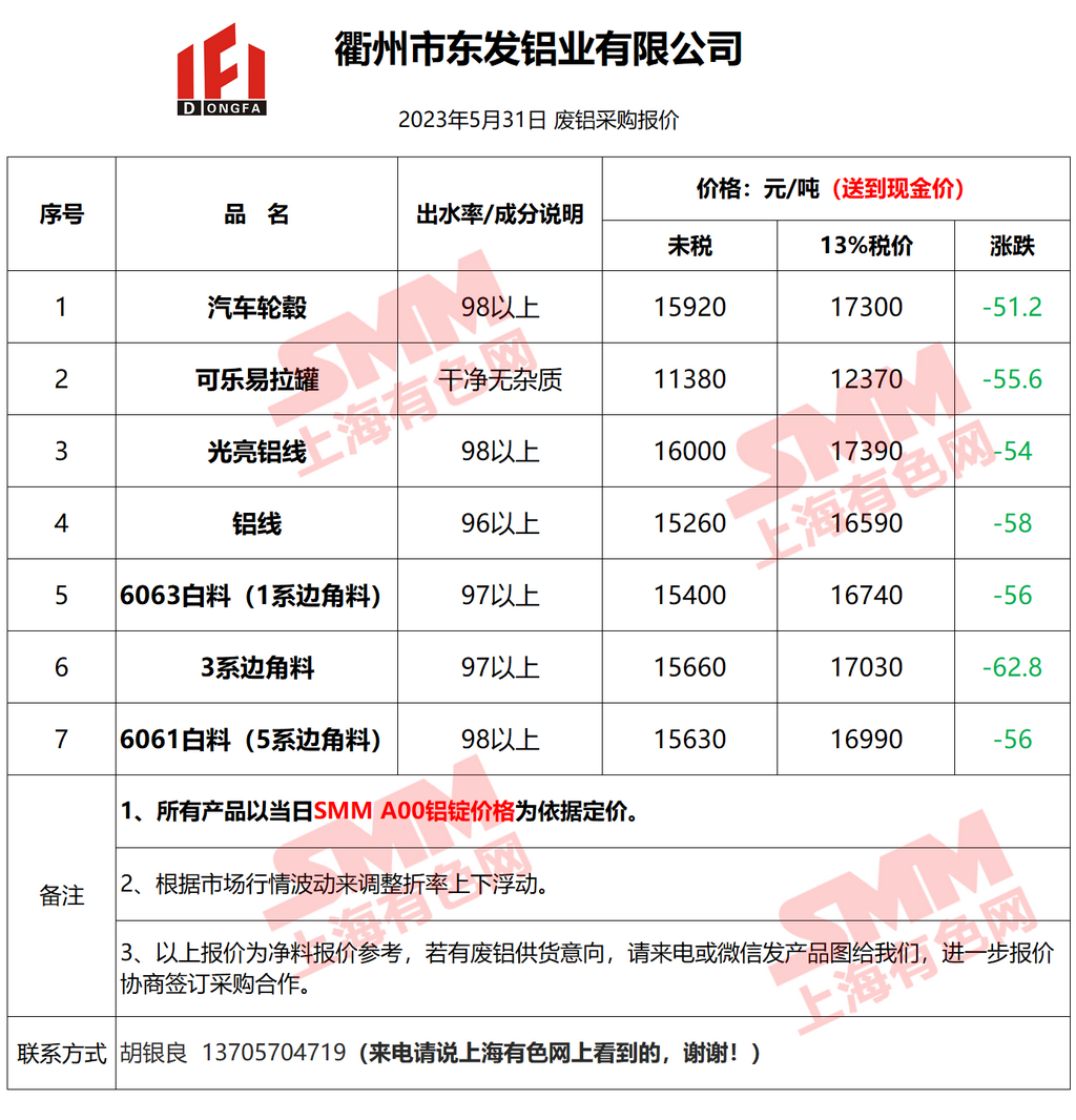 5月31日衢州东发 废铝采购报价