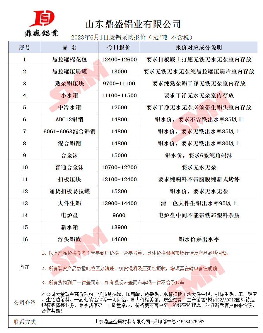 今日山东鼎盛铝业 废铝采购报价已更新,有货的朋友欢迎联系我们!