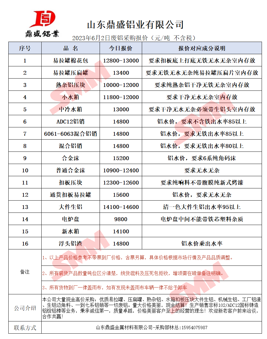 今日山东鼎盛铝业 废铝采购报价已更新,有货的朋友欢迎联系我们!