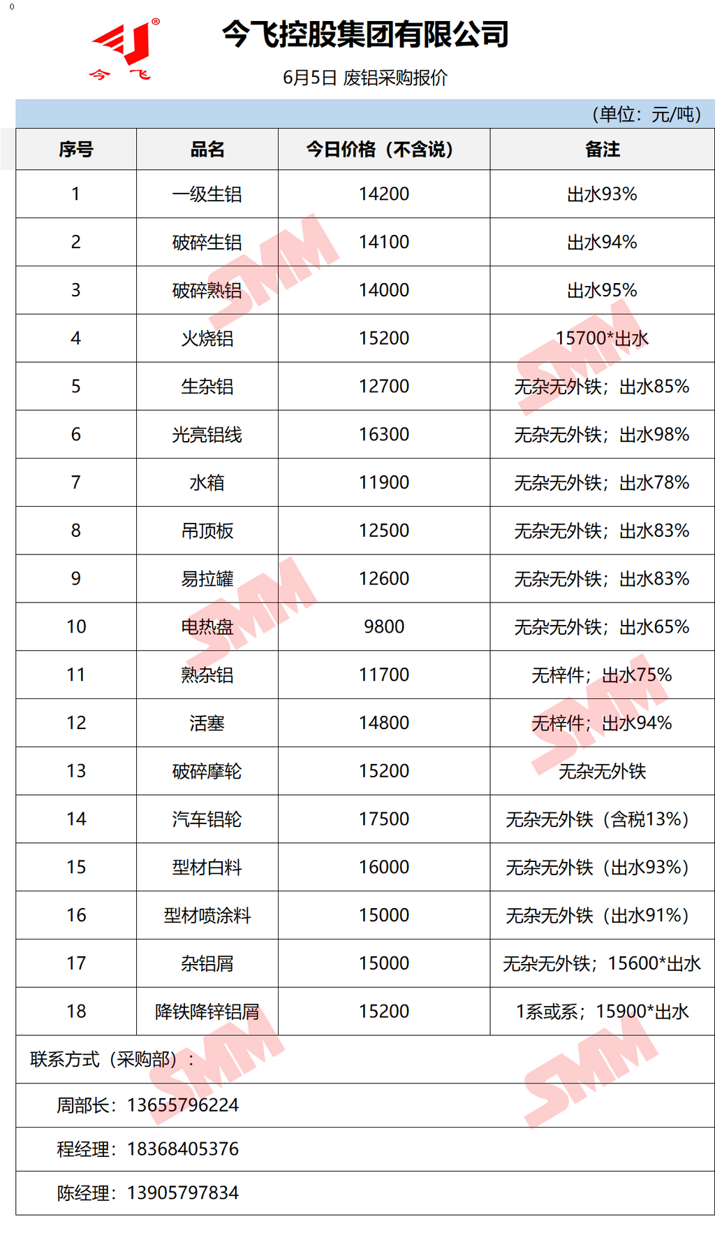 6月5日今飞集团 废铝采购报价