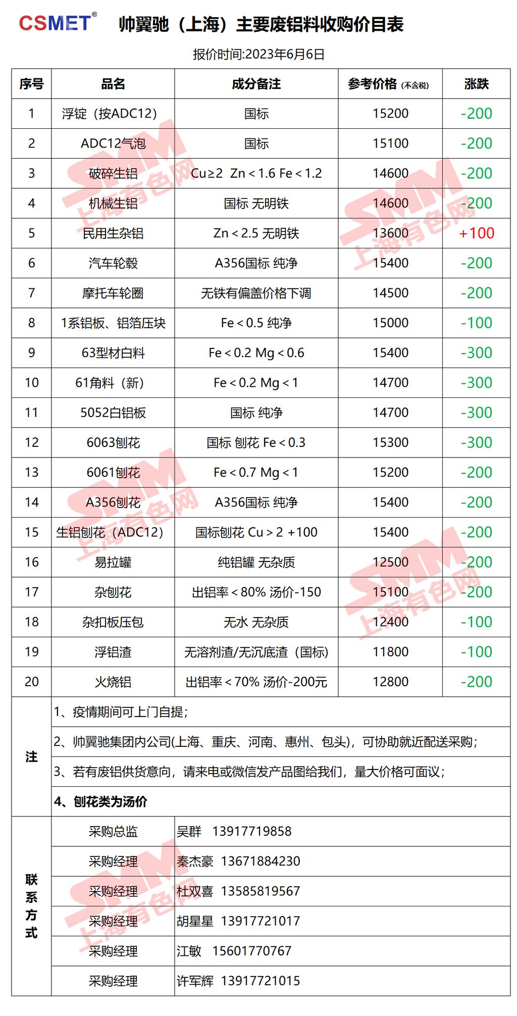 6月6日帅翼驰(上海) 废铝采购报价