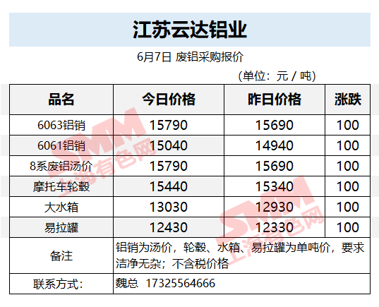6月7日江苏云达铝业 废铝采购报价