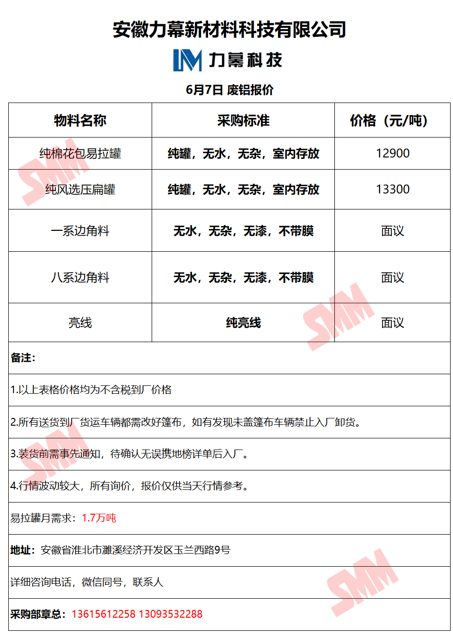今日安徽力幕新材料科技有限公司 废铝采购报价已更新,有货的朋友欢迎联系我们!