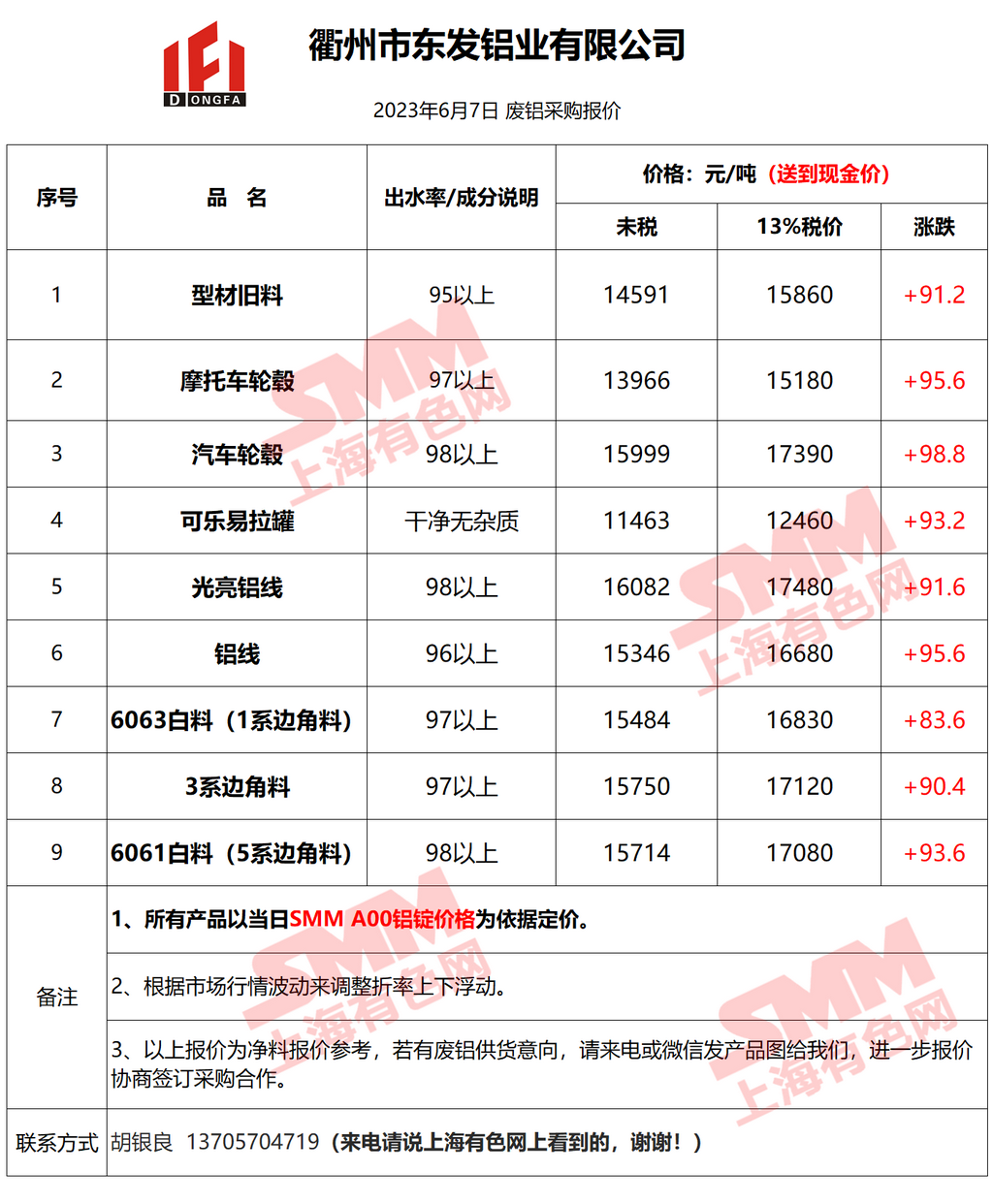 今日衢州东发 废铝采购报价已更新,有货的朋友欢迎联系我们!