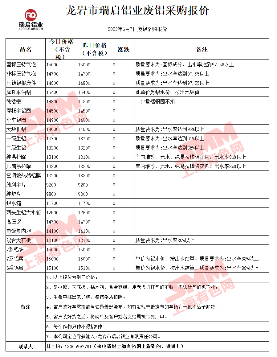 6月7日龙岩瑞启 废铝采购报价
