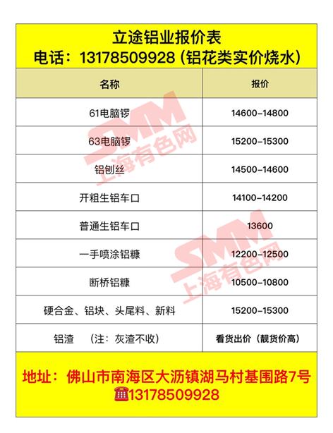 佛山立途铝业有限公司 今日废铝采购报价已更新,有货的欢迎来电咨询。