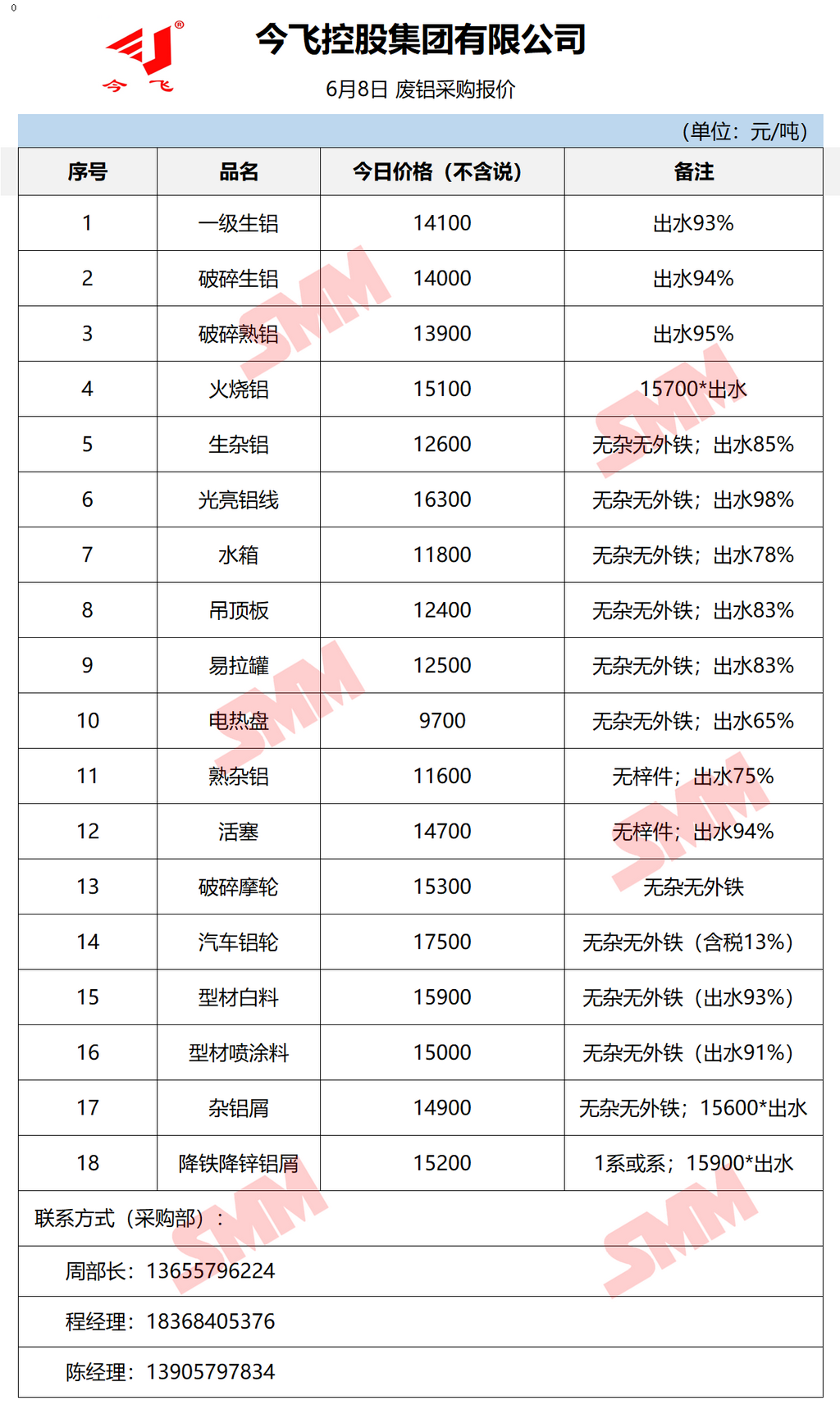 今日今飞集团 废铝采购报价已更新,有货的朋友欢迎联系我们!