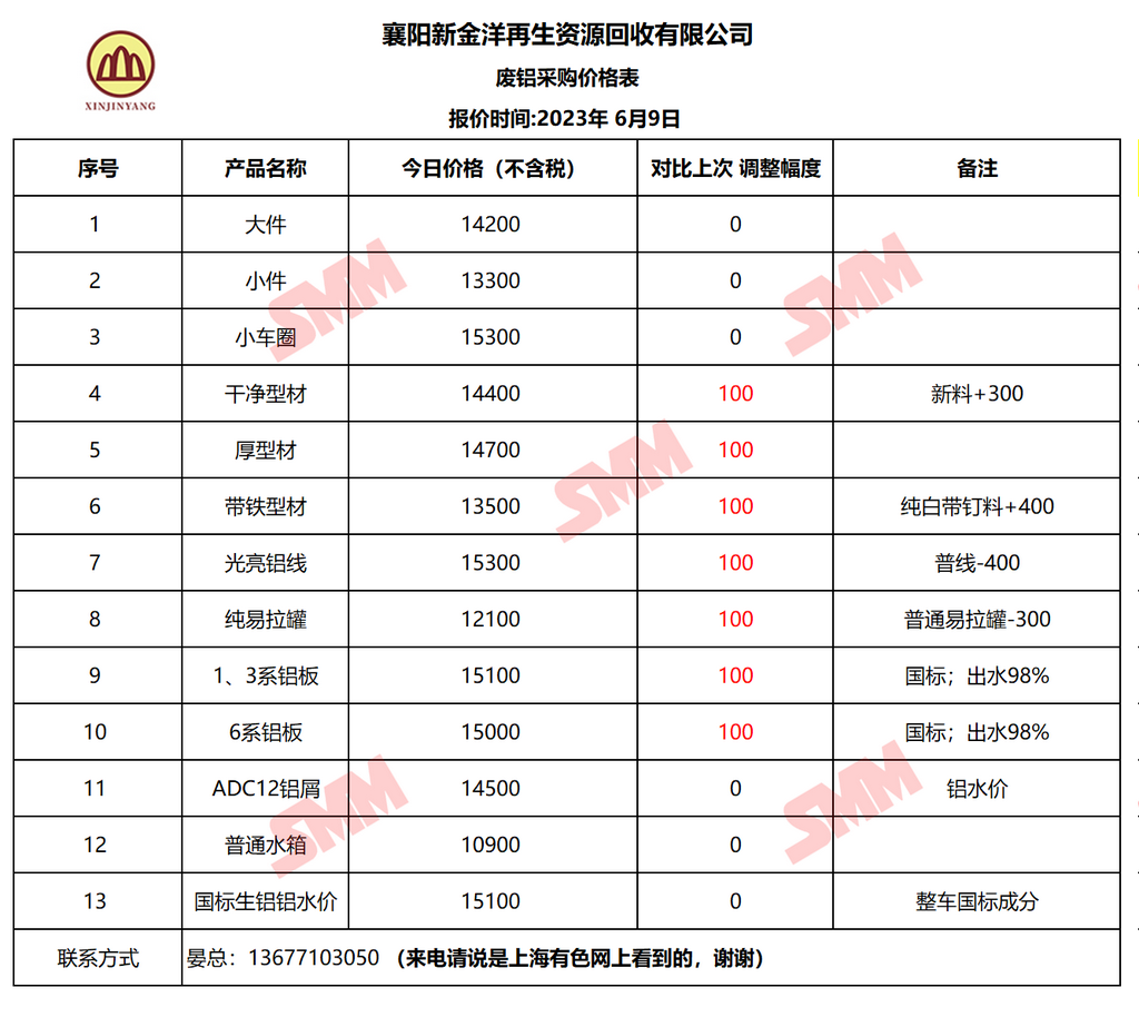 6月9日襄阳新金洋 废铝采购报价