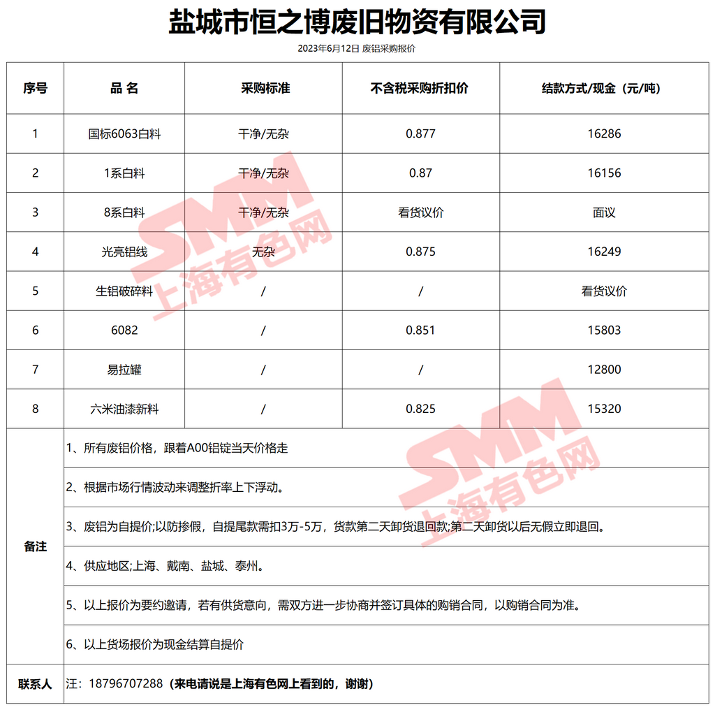 6月12日盐城市恒之博 废铝采购报价