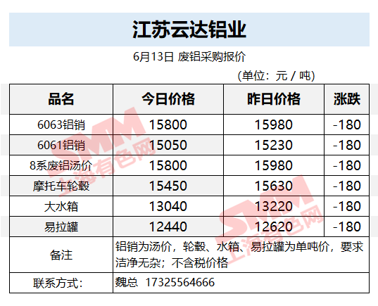 今日江苏云达铝业 废铝采购报价已更新,有货的朋友欢迎联系我们!